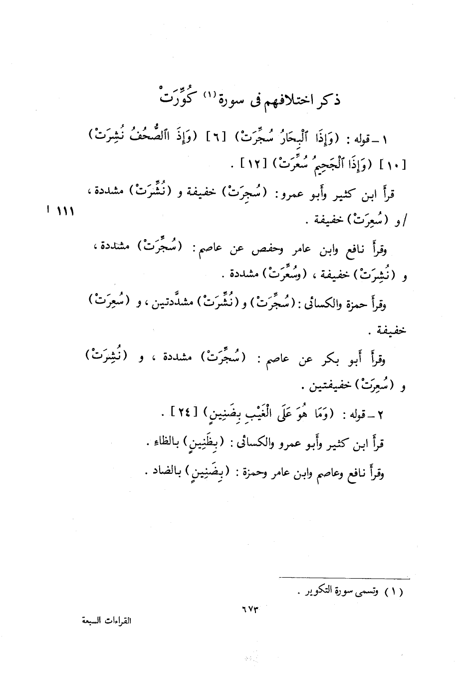 وَقَرَأَ نَافِع وَابْن عَامر وَحَفْص عَن عَاصِم {سجرت} مُشَدّدَة و {نشرت} خَفِيفَة و {سعرت} مُشَدّدَة