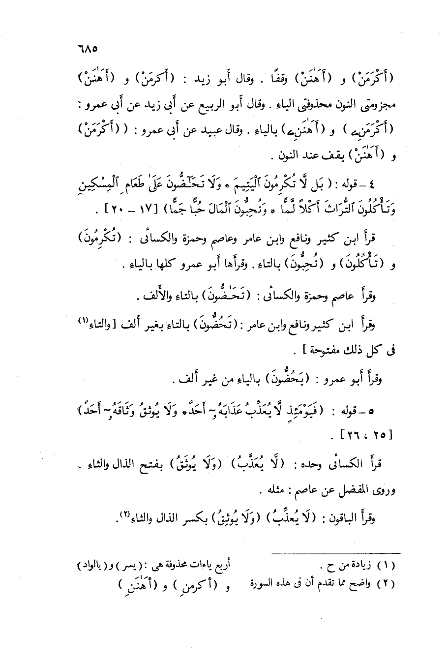 قَرَأَ ابْن كثير وَنَافِع وَابْن عَامر وَعَاصِم وَحَمْزَة والكسائى {تكرمون} و {تَأْكُلُونَ} و {تحبون} بِالتَّاءِ