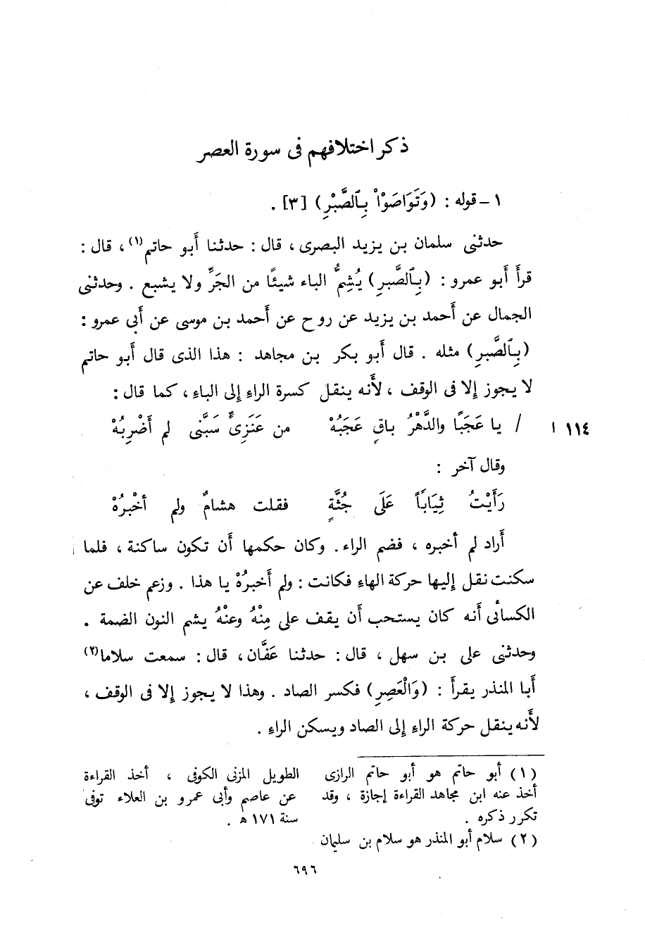 حَدَّثَنى سلمَان بن يزِيد البصرى قَالَ حَدثنَا أَبُو حَاتِم قَالَ قَرَأَ أَبُو عَمْرو {بِالصبرِ} يشم الْبَاء شَيْئا من الْجَرّ وَلَا يشْبع