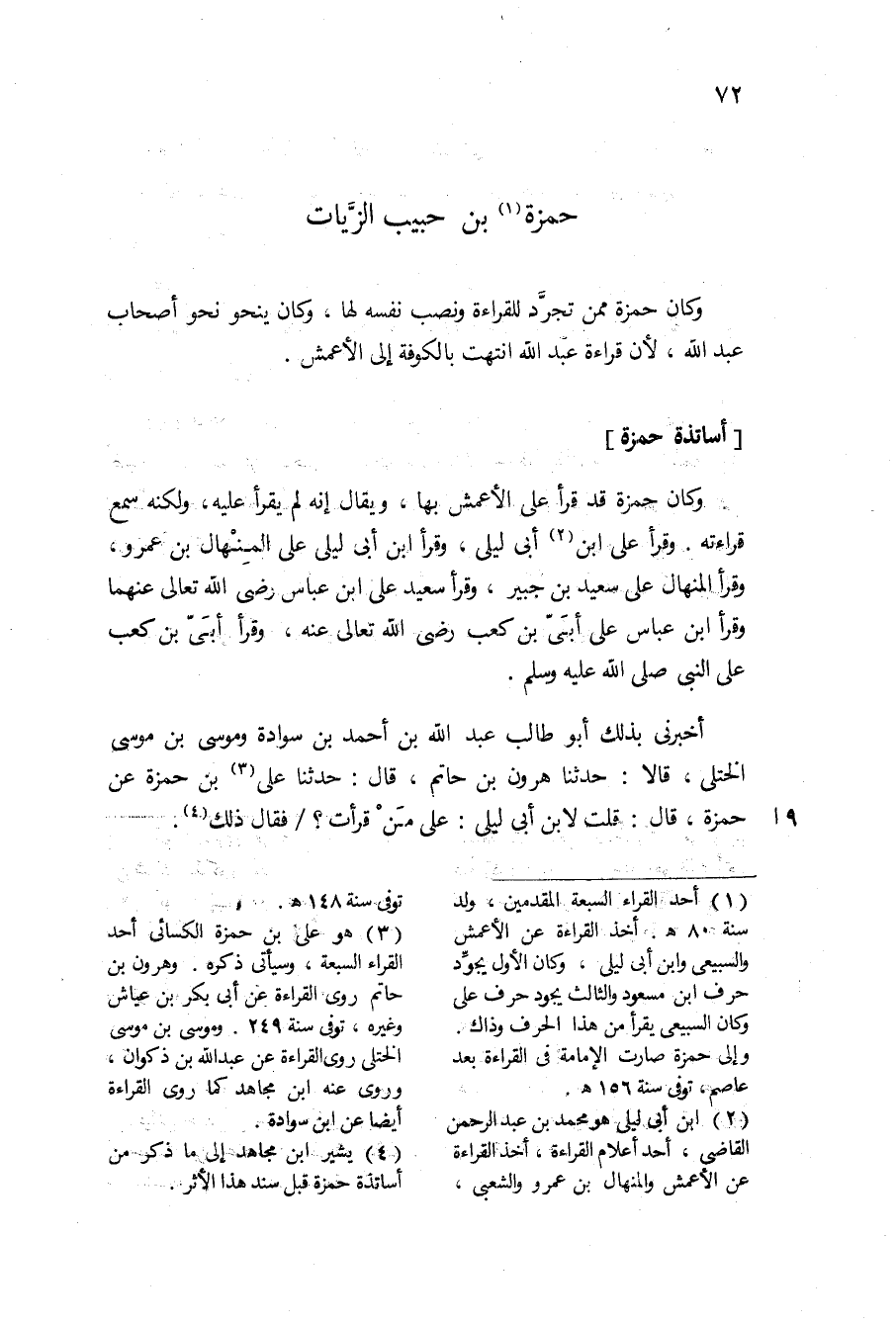 أَخْبرنِي بذلك أَبُو طَالب عبد الله بن أَحْمد بن سوَادَة ومُوسَى بن مُوسَى الْخُتلِي قَالَا حَدثنَا هرون بن حَاتِم قَالَ حَدثنَا عَليّ بن حَمْزَة الْكسَائي عَن حَمْزَة قَالَ قلت لِابْنِ أبي ليلى على من قَرَأت فَقَالَ ذَلِك