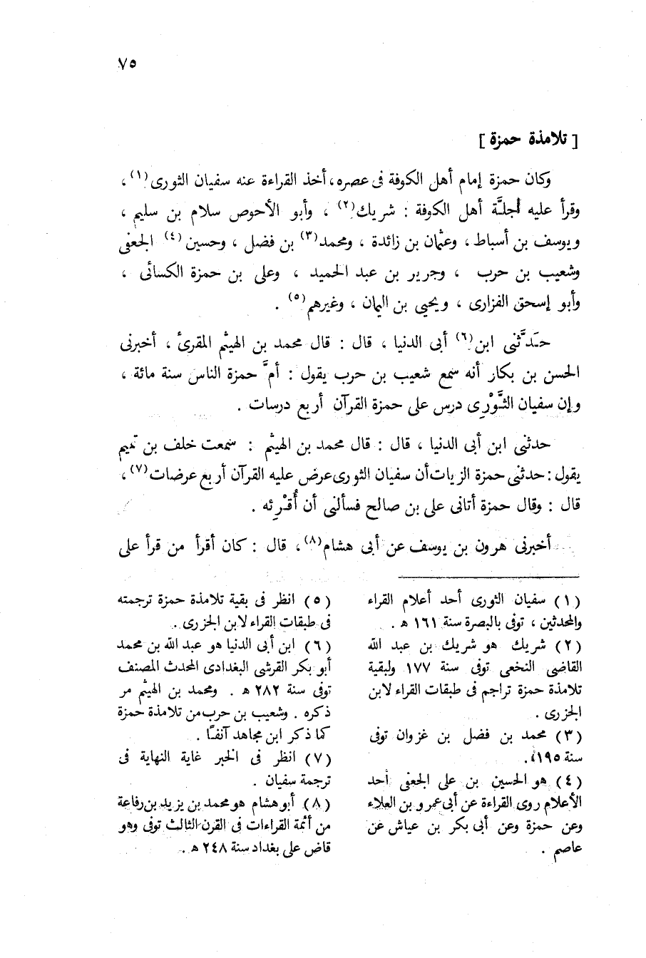 وَكَانَ حَمْزَة مُتبعا لآثار من أدْرك من أَئِمَّة الْقُرَّاء عَالما بِالْقِرَاءَةِ ومذاهبها