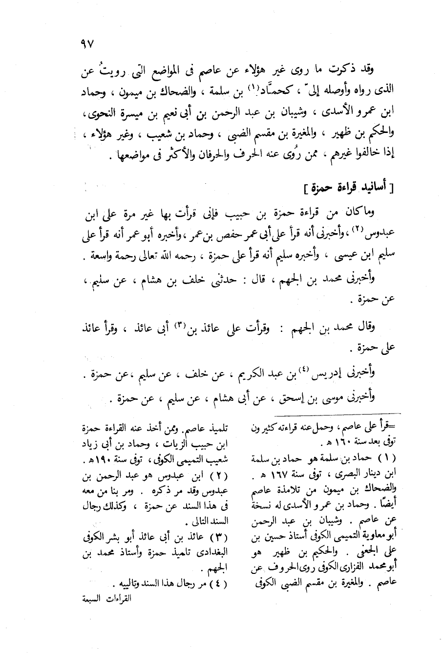 وَمَا كَانَ من قِرَاءَة حَمْزَة بن حبيب فَإِنِّي قَرَأت بهَا غير مرّة على ابْن عَبدُوس وَأَخْبرنِي أَنه قَرَأَ على أبي عمر حَفْص بن عمر وَأخْبرهُ أَبُو عمر أَنه قَرَأَ على سليم بن عِيسَى وَأخْبرهُ سليم أَنه قَرَأَ على حَمْزَة رَحمَه الله تَعَالَى رَحْمَة وَاسِعَة