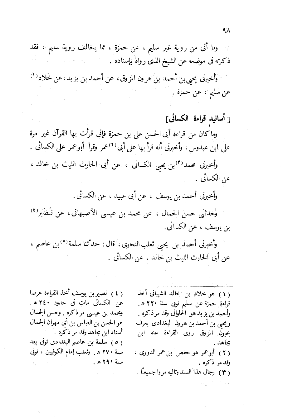 وَمَا كَانَ من قِرَاءَة أبي الْحسن عَليّ بن حَمْزَة الْكسَائي فَإِنِّي قَرَأت بهَا الْقُرْآن غير مرّة على ابْن عَبدُوس وَأَخْبرنِي أَنه قَرَأَ بهَا على أبي عمر وَقَرَأَ أَبُو عمر على الْكسَائي