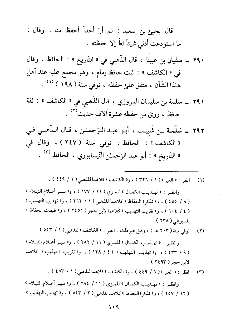 290 - سفيان بن عيينة، قال الذّهبي في "التّاريخ": الحافظ. وقال في "الكاشف": ثبت حافظ إمام، وهو مجمع عليه عند أهل هذا الشّأن، متفق على حفظه، توفي سنة (198) (¬1).