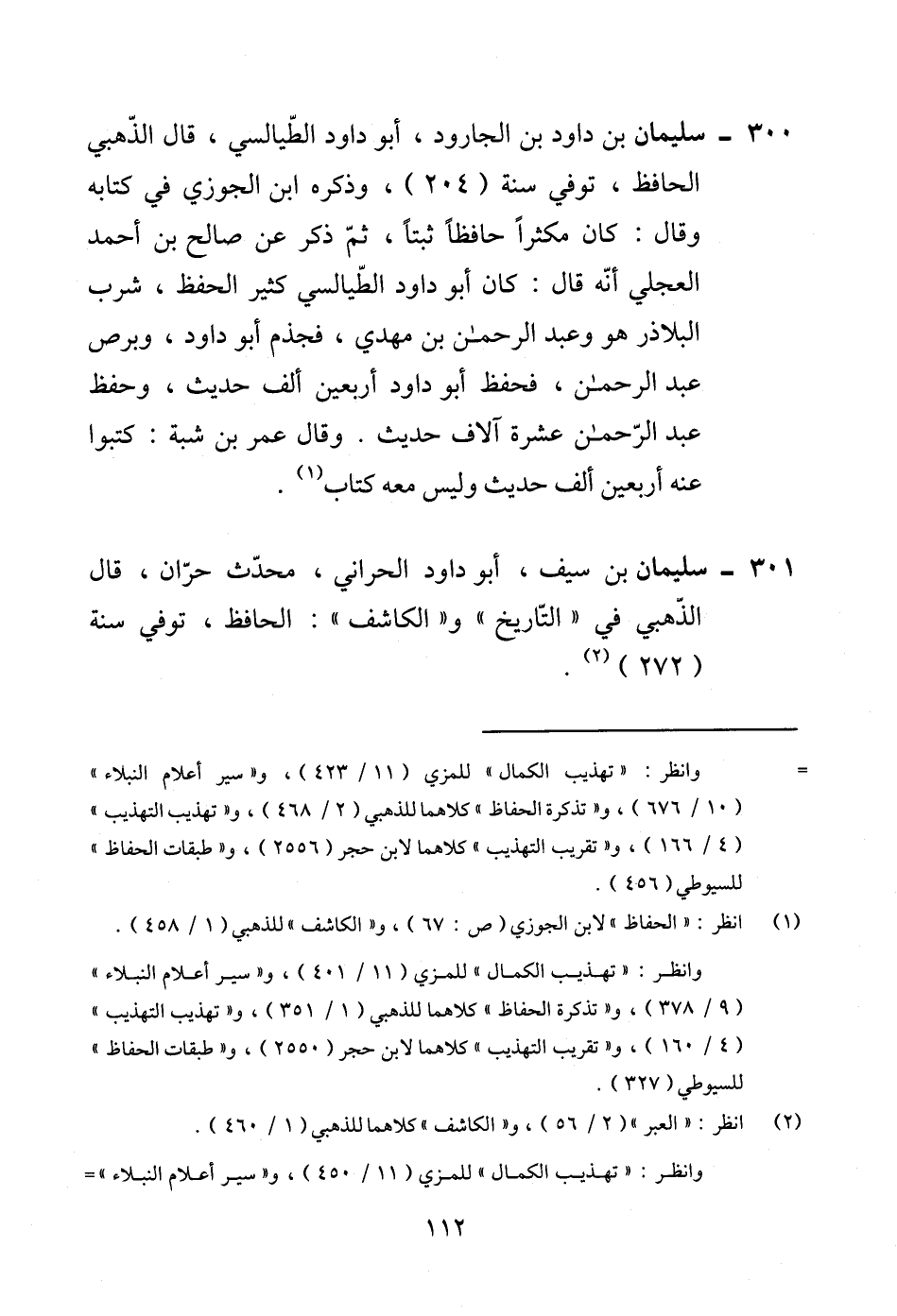 300 - سليمان بن داود بن الجارود، أبو داود الطّيالسي، قال الذّهبي الحافظ، توفي سنة (204)، وذكره ابن الجوزي في كتابه وقال: كان مكثرًا حافظًا ثبتًا، ثم ذكر عن صالح بن أحمد العجلي أنّه قال: كان أبو داود الطّيالسي كثير الحفظ، شرب البلاذر هو وعبد الرحمن بن مهدي، فجذم أبو داود، وبرص عبد الرحمن، فحفظ أبو داود أربعين ألف حديث، وحفظ عبد الرحمن عشرة آلاف حديث. وقال عمر بن شبة: كتبوا عنه أربعين ألف حديث وليس معه كتاب (¬1).