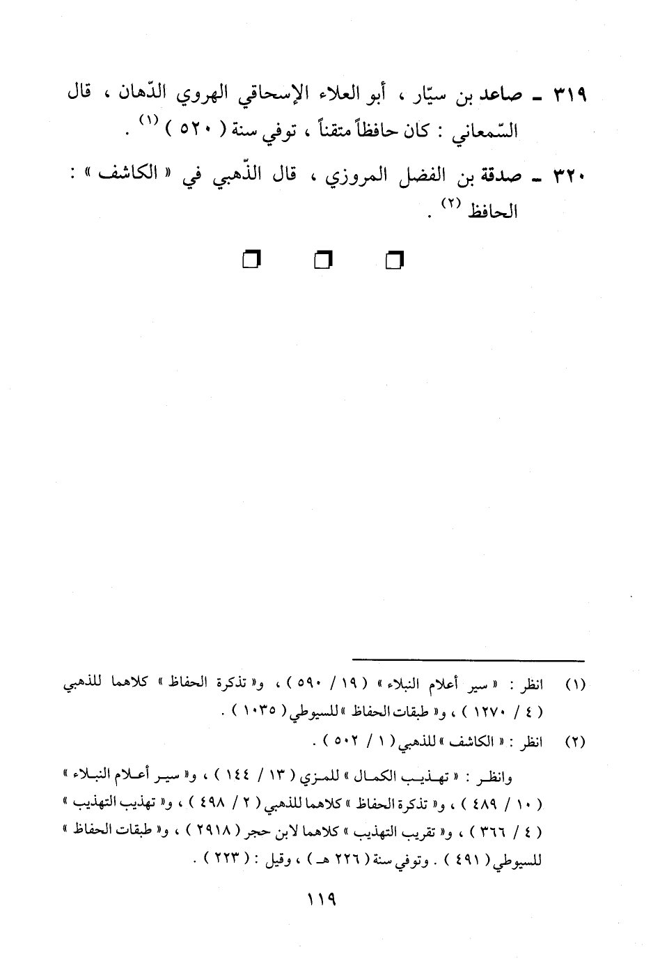 319 - صاعد بن سيّار، أبو العلاء الإسحاقي الهروي الدّهان، قال السّمعاني: كان حافظًا متقنًا، توفي سنة (520) (¬1).