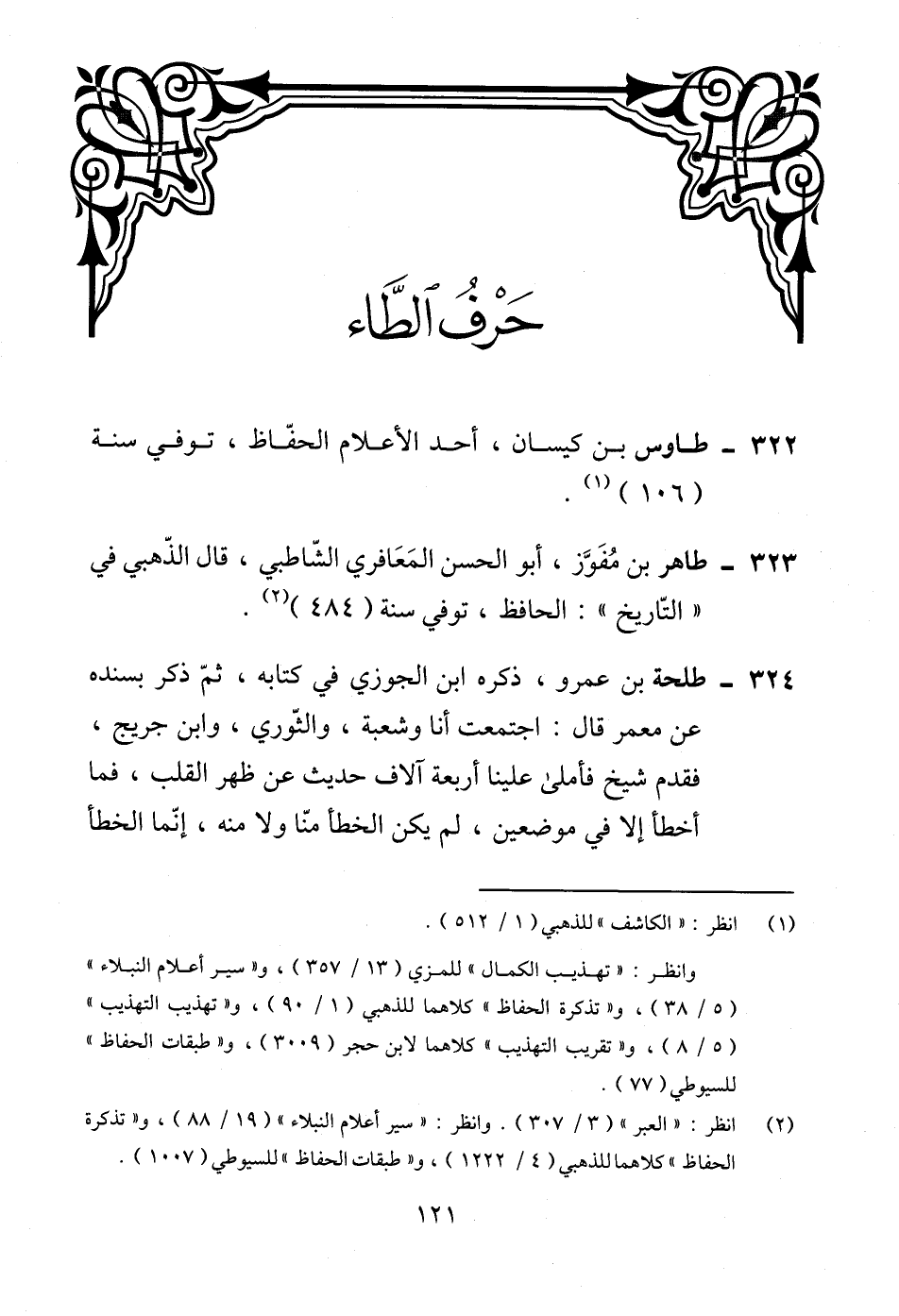 324 - طلحة بن عمرو، ذكره ابن الجوزي في كتابه، ثم ذكر بسنده عن معمر قال: اجتمعت أنا وشعبة، والثّوري، وابن جريج، فقدم شيخ فأملى علينا أربعة آلاف حديث عن ظهر القلب، فما أخطأ إلا في موضعين، لم يكن الخطأ منّا ولا منه، إنّما الخطأ