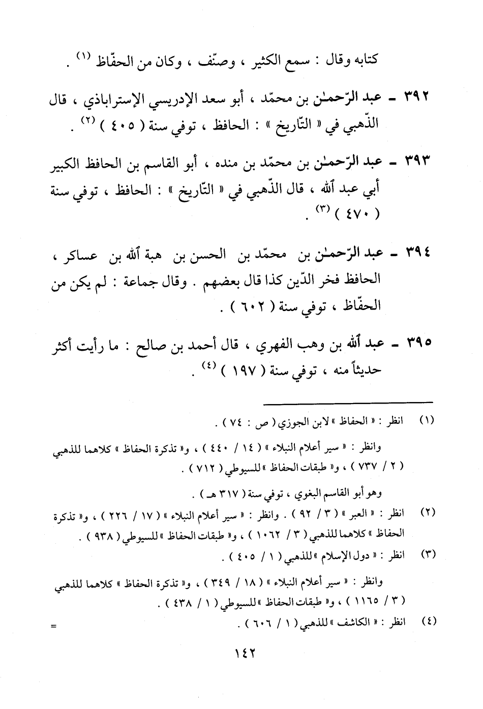 392 - عبد الرّحمن بن محمّد، أبو سعد الإدريسي الإستراباذي، قال الذّهبي في "التّاريخ": الحافظ، توفي سنة (405) (¬2).