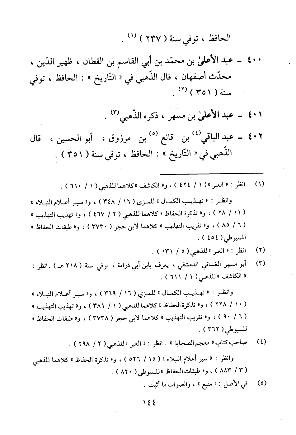 400 - عبد الأعلي بن محمّد بن أبي القاسم بن القطان، ظهير الدّين، محدّث أصفهان، قال الذّهبي في "التّاريخ": الحافظ، توفي سنة (351) (¬2).