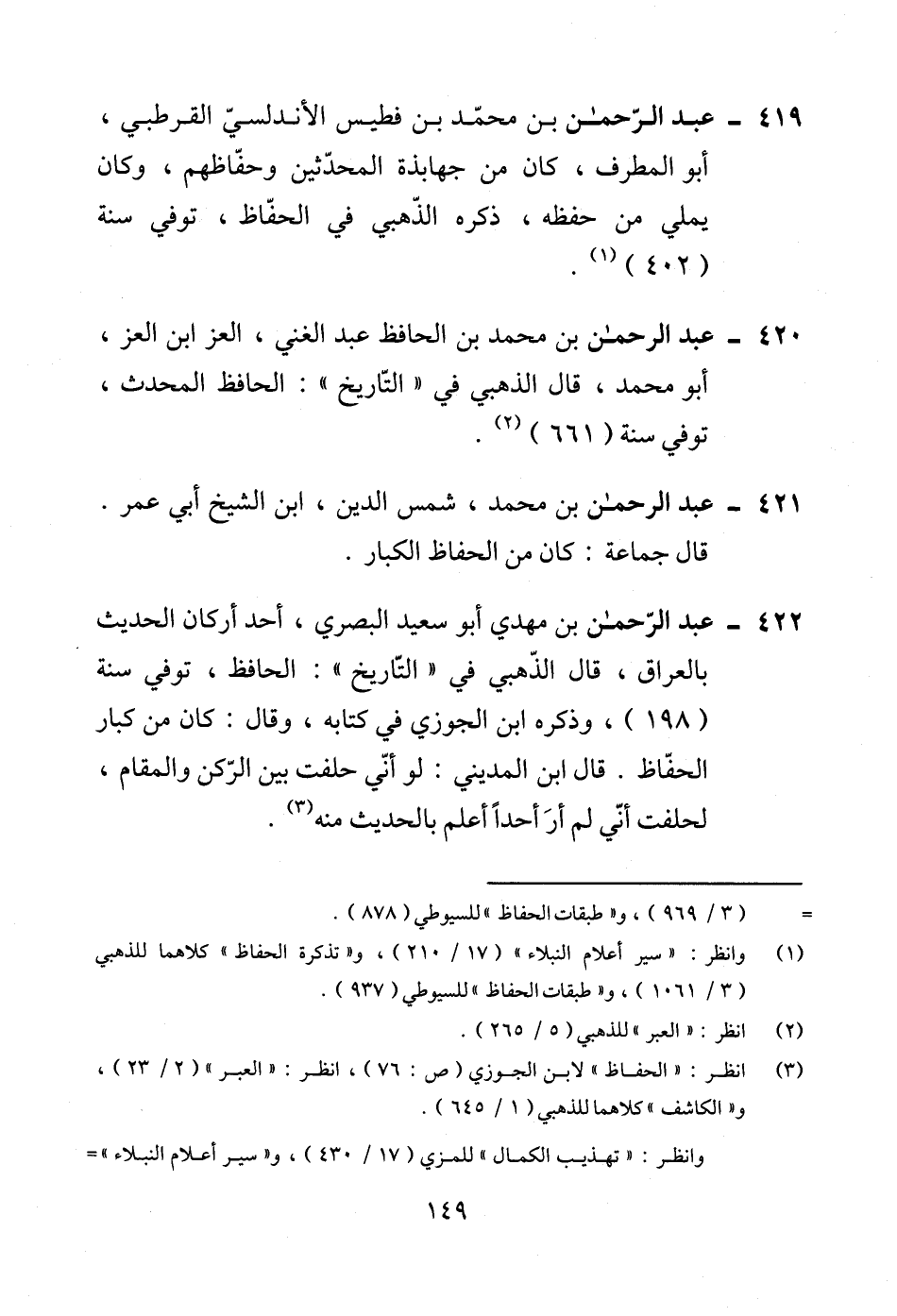 422 - عبد الرّحمن بن مهدي أبو سعيد البصري، أحد أركان الحديث بالعراق، قال الذّهبي في "التّاريخ": الحافظ، توفي سنة (198)، وذكره ابن الجوزي في كتابه، وقال: كان من كبار الحفّاظ. قال ابن المديني: لو أنّي حلفت بين الرّكن والمقام، لحلفت أنّي لم أرَ أحدًا أعلم بالحديث منه (¬3).