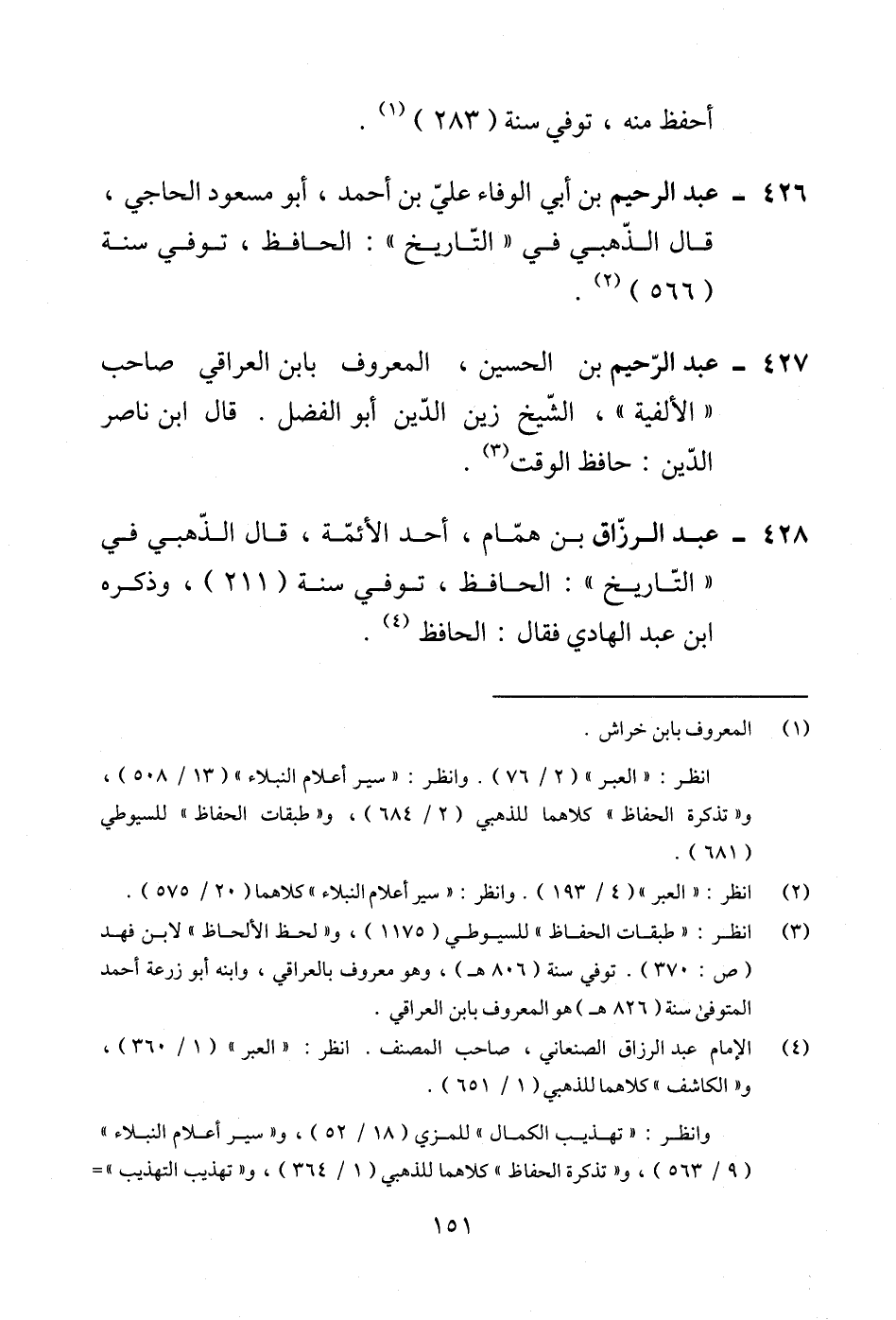 428 - عبد الرزّاق بن همّام، أحد الأئمّة، قال الذّهبي في "التّاريخ": الحافظ، توفي سنة (211)، وذكره ابن عبد الهادي فقال: الحافظ (¬4).