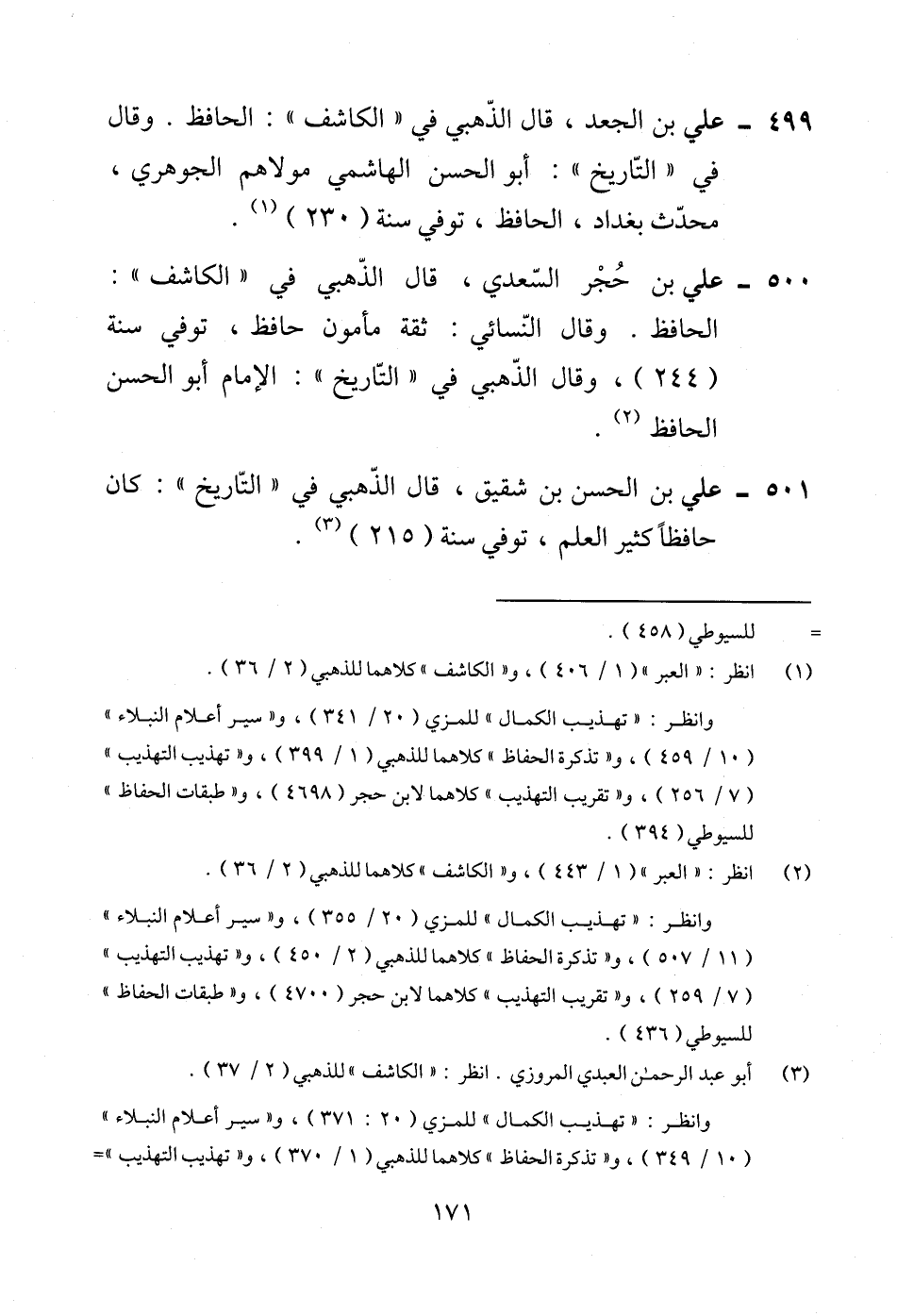 499 - علي بن الجعد، قال الذّهبي في "الكاشف": الحافظ. وقال في "التّاريخ": أبو الحسن الهاشمي مولاهم الجوهري، محدّث بغداد، الحافظ، توفي سنة (235) (¬1).