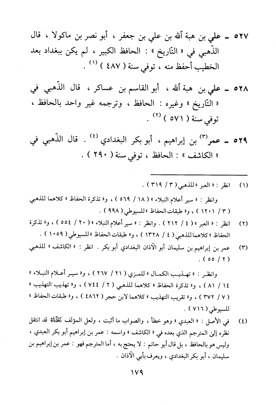 527 - علي بن هبة الله بن علي بن جعفر، أبو نصر بن ماكولا، قال الذّهبي في "التّاريخ": الحافظ الكبير، لم يكن ببغداد بعد الخطيب أحفظ منه، توفي سنة (487) (¬1).