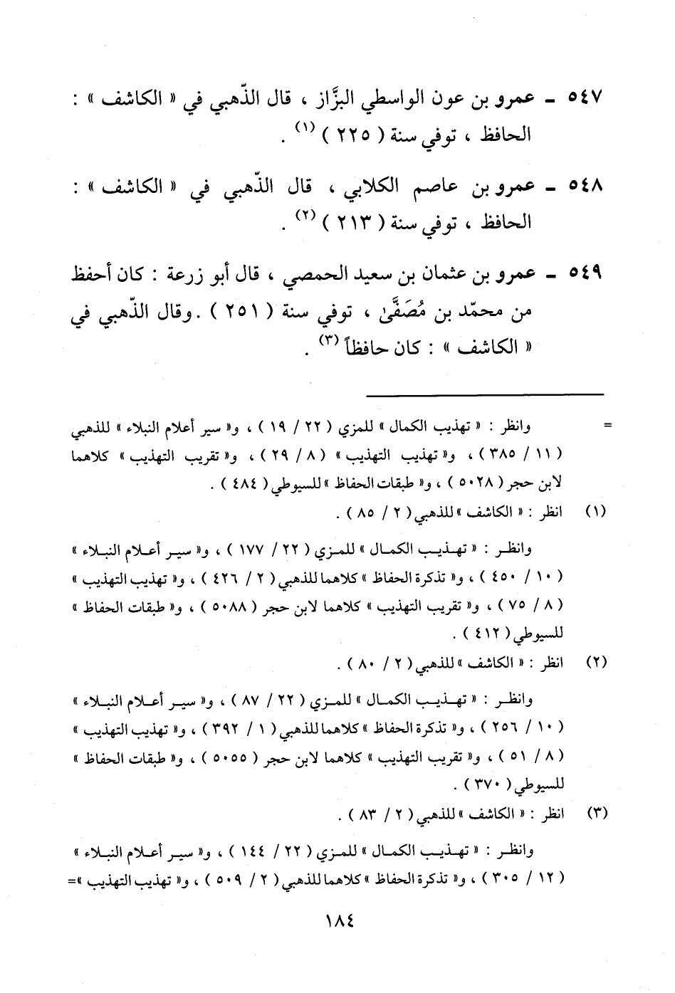 549 - عمرو بن عثمان بن سعيد الحمصي، قال أبو زرعة: كان أحفظ من محمّد بن مُصَفَّى، توفي سنة (251). وقال الذّهبي في "الكاشف": كان حافظا (¬3).