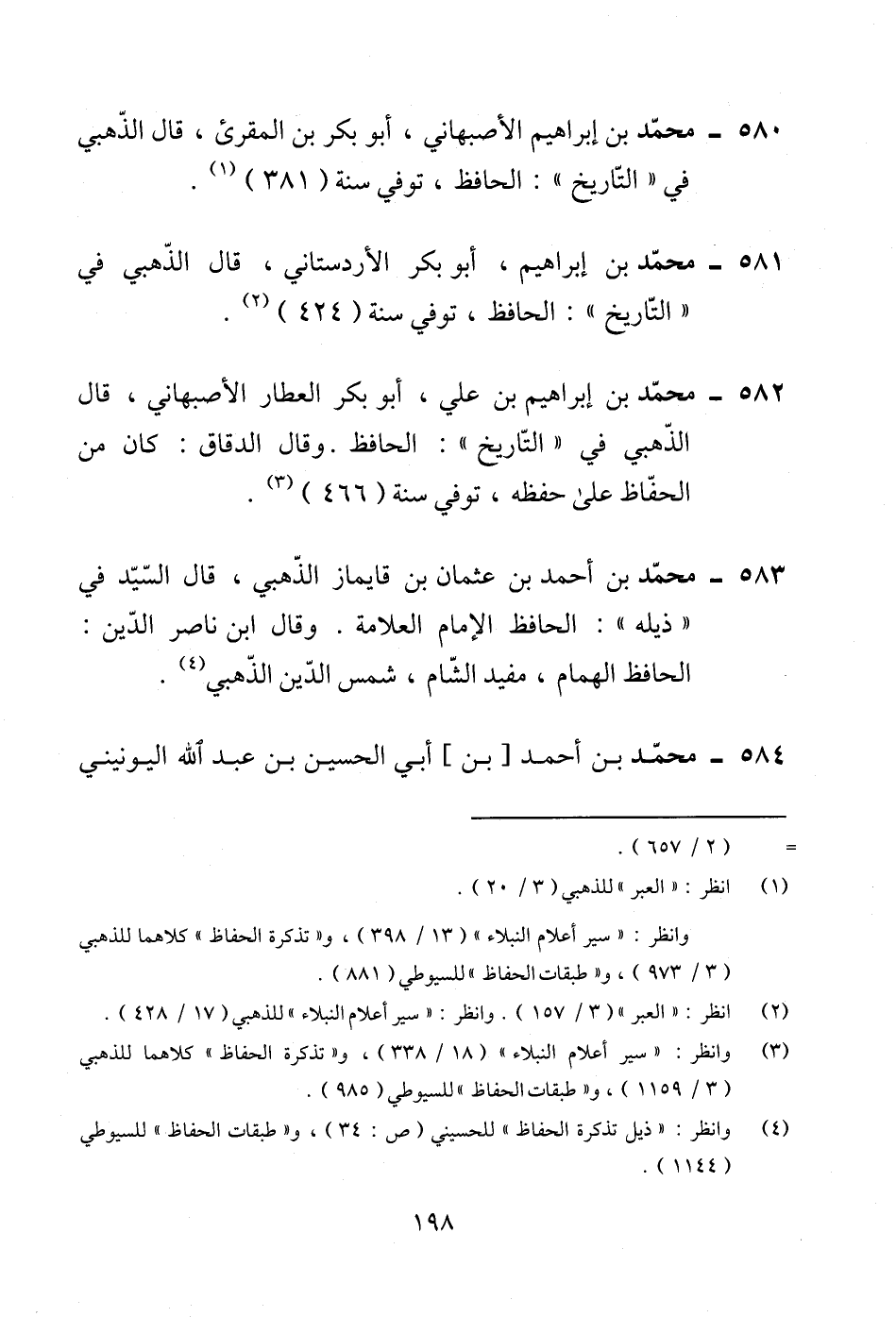 582 - محمّد بن إبراهيم بن علي، أبو بكر العطار الأصبهاني، قال الذّهبي في "التّاريخ": الحافظ. وقال الدقاق: كان من الحفّاظ على حفظه، توفي سنة (466) (¬3).