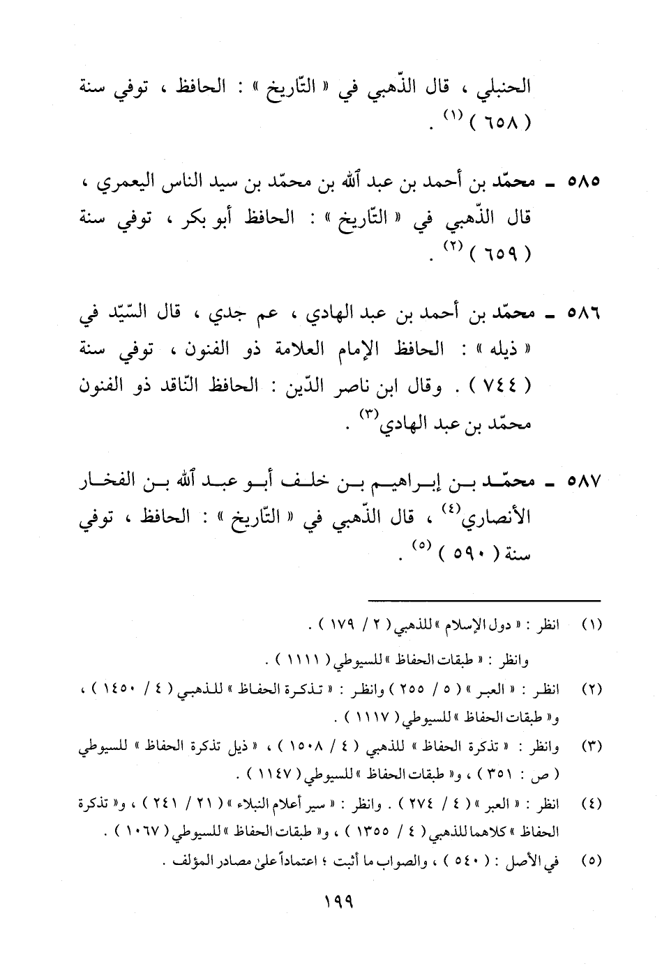 "ذيله": الحافظ الإمام العلامة ذو الفنون، توفي سنة (744). وقال ابن ناصر الدّين: الحافظ النّاقد ذو الفنون محمّد بن عبد الهادي (¬3).