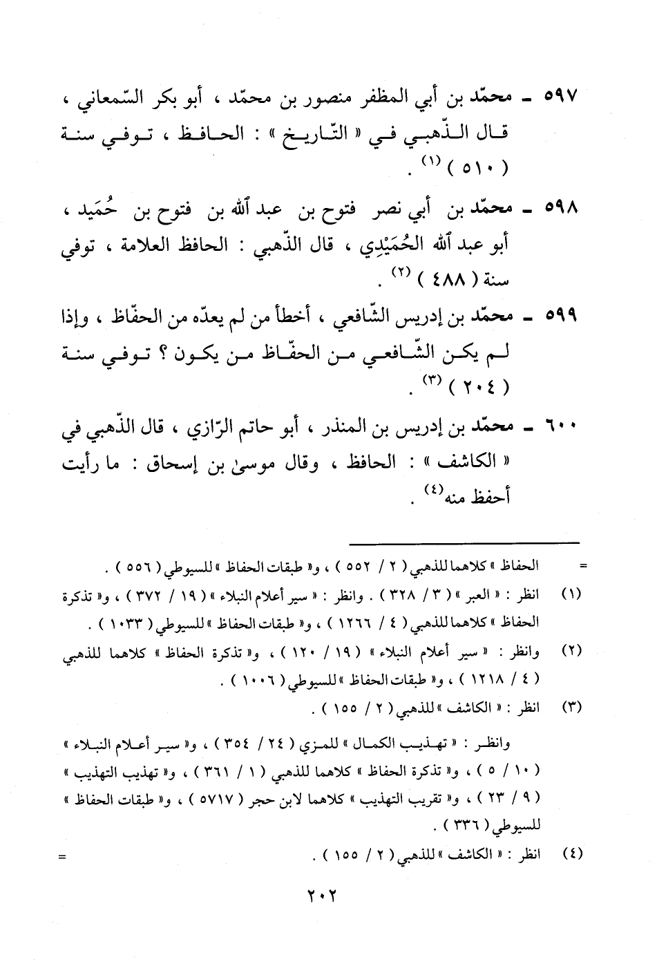 599 - محمّد بن إدريس الشّافعي، أخطأ من لم يعدّه من الحفّاظ، وإذا لم يكن الشّافعي من الحفّاظ من يكون؟ توفى سنة (204) (¬3).