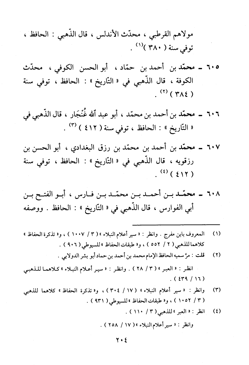 605 - محمّد بن أحمد بن حمّاد، أبو الحسن الكوفي، محدّث الكوفة، قال الذّهبي في "التّاريخ": الحافظ، توفي سنة (384) (¬2).