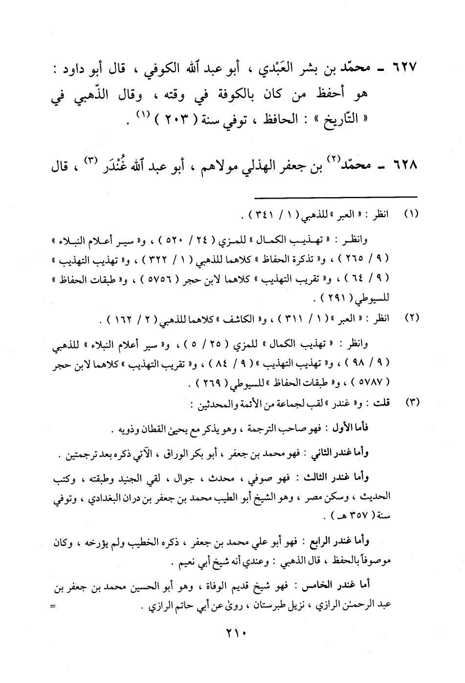 627 - محمد بن بشر العَبْدي، أبو عبد الله الكوفي، قال أبو داود: هو أحفظ من كان بالكوفة في وقته، وقال الذّهبي في "التّاريخ": الحافظ، توفي سنة (203) (¬1).