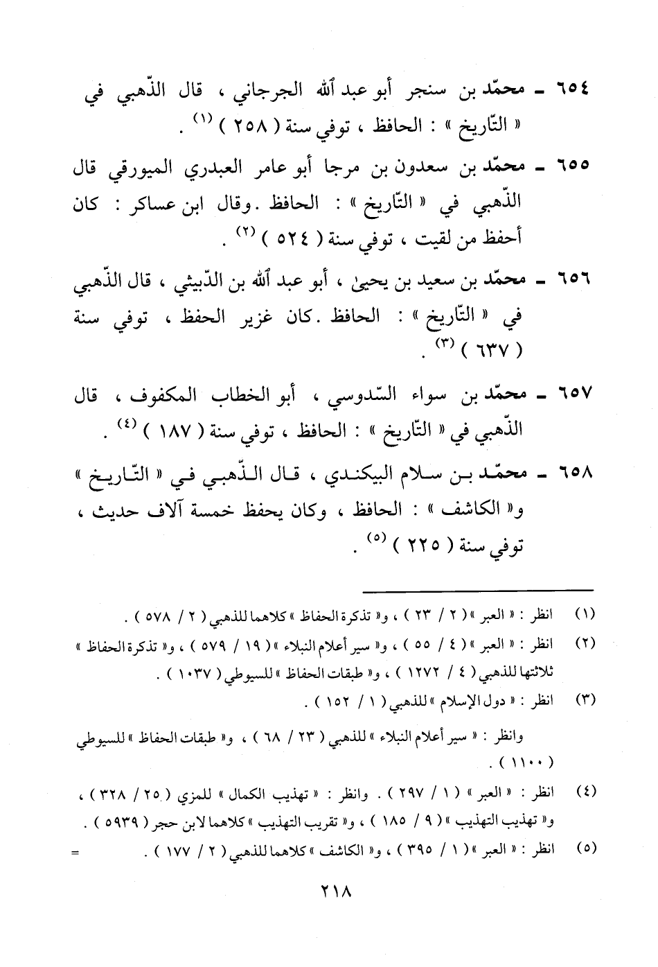 658 - محمّد بن سلام البيكندْي، قال الذّهبي في "التّاريخ" و"الكاشف": الحافظ، وكان يحفظ خمسة آلاف حديث، توفي سنة (225) (¬5).