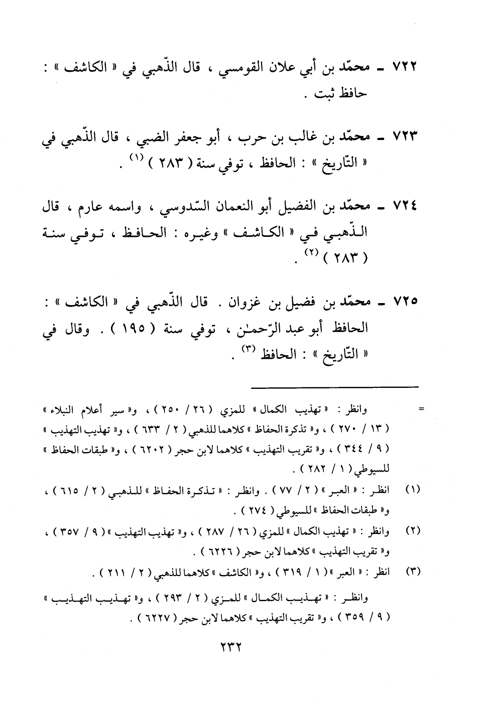 725 - محمّد بن فضيل بن غزوان. قال الذّهبي في "الكاشف": الحافظ أبو عبد الرحمن، توفي سنة (195). وقال في "التّاريخ": الحافظ (¬3).