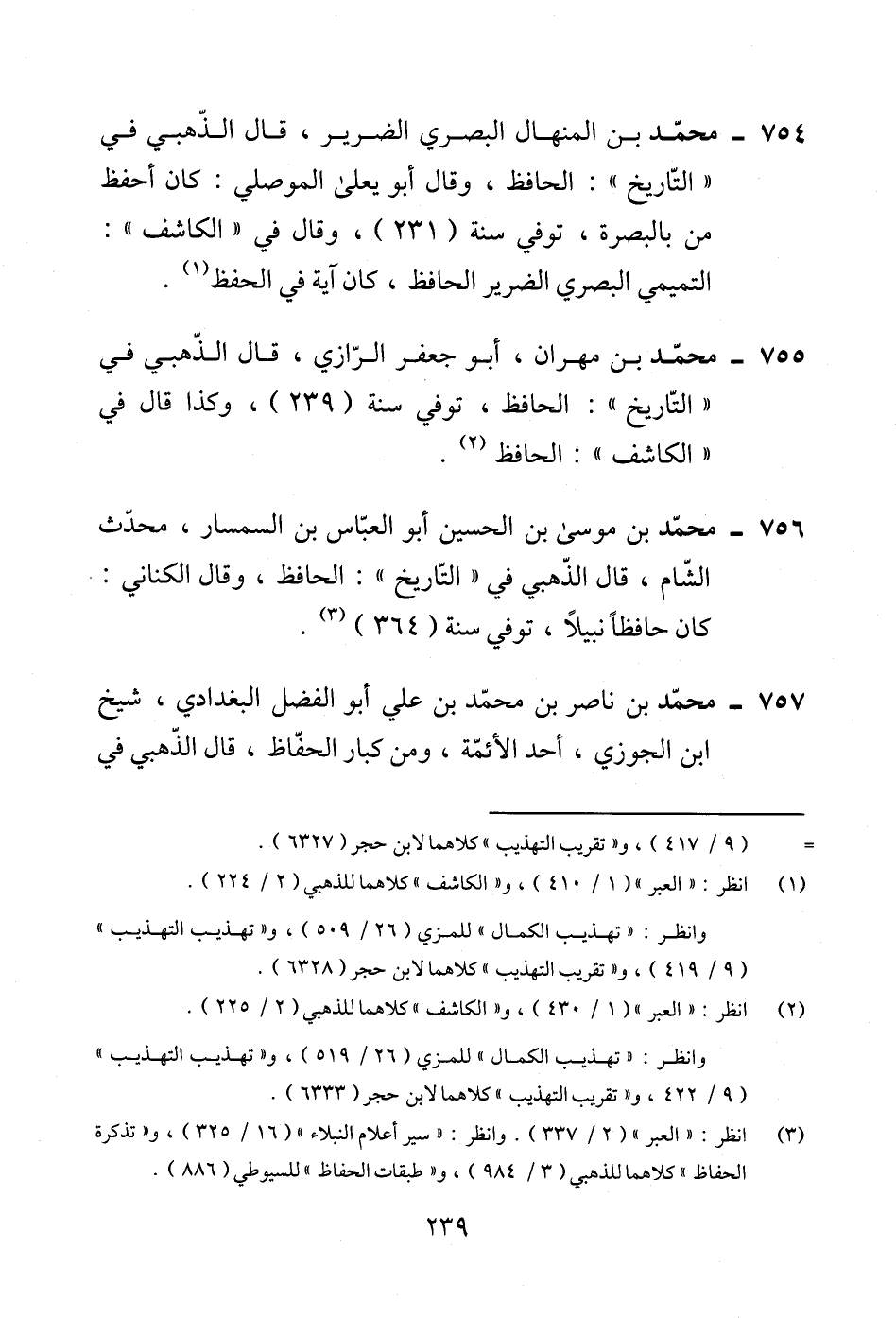 754 - محمّد بن المنهال البصري الضرير، قال الذّهبي في "التّاريخ": الحافظ، وقال أبو يعلى الموصلي: كان أحفظ من بالبصرة، توفي سنة (231)، وقال في "الكاشف": التميمي البصري الضرير الحافظ، كان آية في الحفظ (¬1).