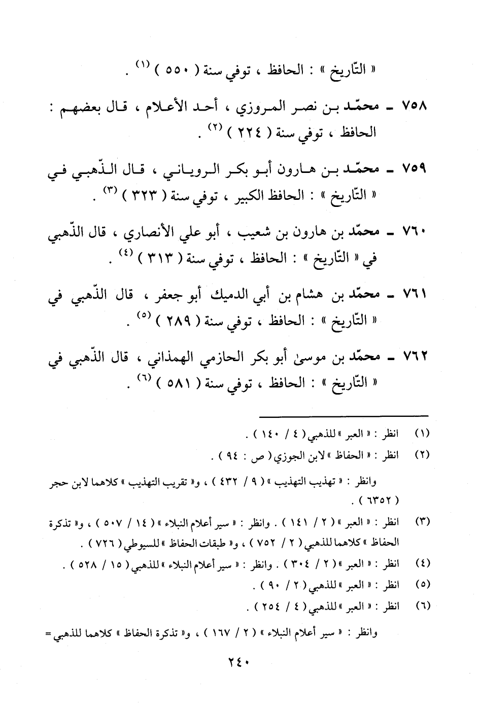 760 - محمّد بن هارون بن شعيب، أبو علي الأنصاري، قال الذّهبي في "التّاريخ": الحافظ، توفي سنة (313) (¬4).
