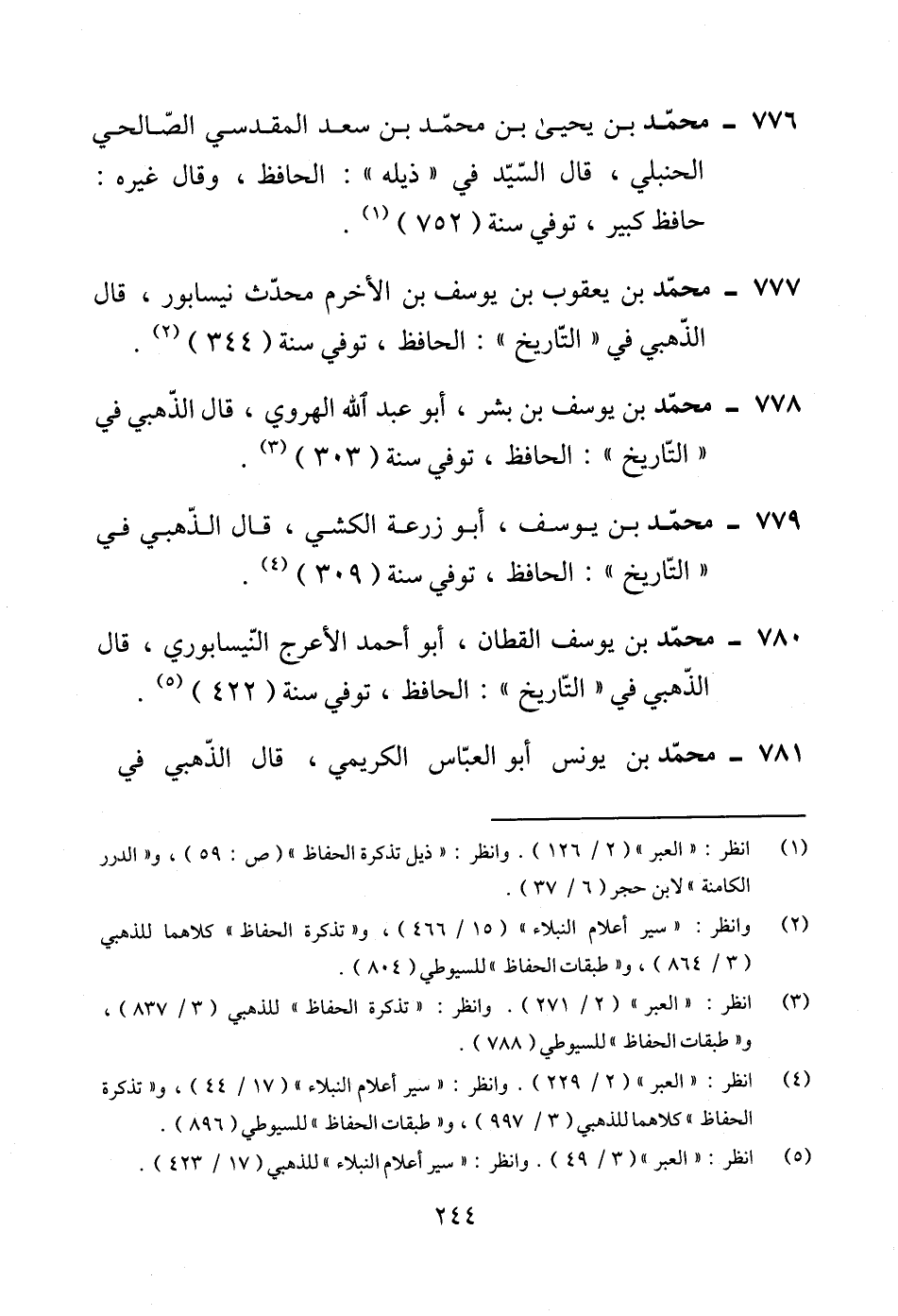 780 - محمّد بن يوسف القطان، أبو أحمد الأعرج النّيسابوري، قال الذّهبي في "التّاريخ": الحافظ، توفي سنة (422) (¬5).
