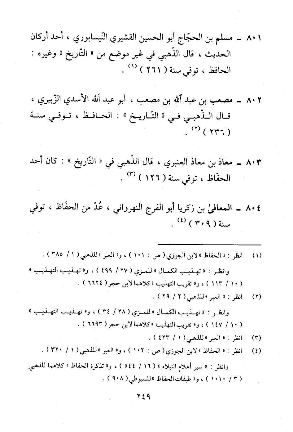 801 - مسلم بن الحجّاج أبو الحسين القشيري النّيسابوري، أحد أركان الحديث، قال الذّهبي في غير موضع من "التّاريخ" وغيره: الحافظ، توفي سنة (261) (¬1).
