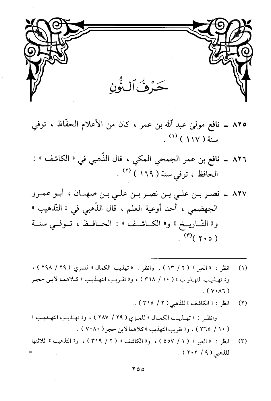 826 - نافع بن عمر الجمحي المكي، قال الذّهبي في "الكاشف": الحافظ، توفي سنة (169) (¬2).