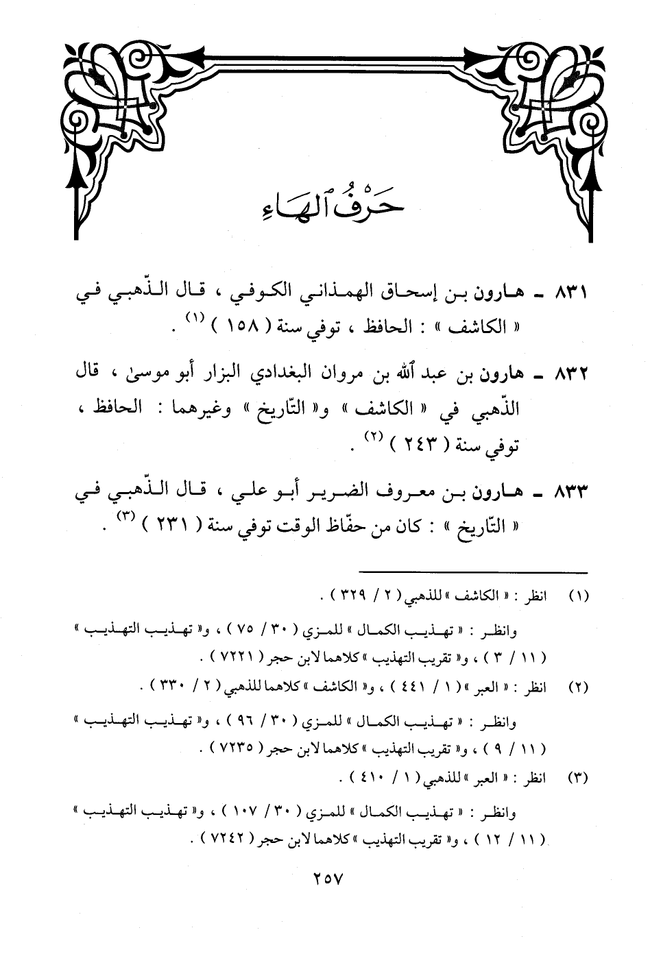 833 - هارون بن معروف الضرير أبو علي، قال الذّهبي في "التّاريخ": كان من حفّاظ الوقت توفي سنة (231) (¬3).
