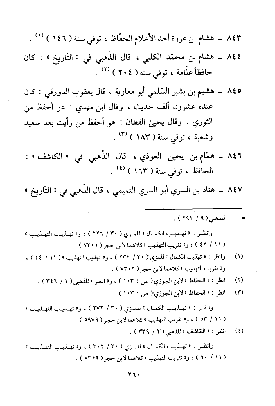 845 - هشيم بن بشير السّلمي أبو معاوية، قال يعقوب الدورقي: كان عنده عشرون ألف حديث، وقال ابن مهدي: هو أحفظ من الثوري. وقال يحيى القطان: هو أحفظ من رأيت بعد سعيد وشعبة، توفي سنة (183) (¬3).