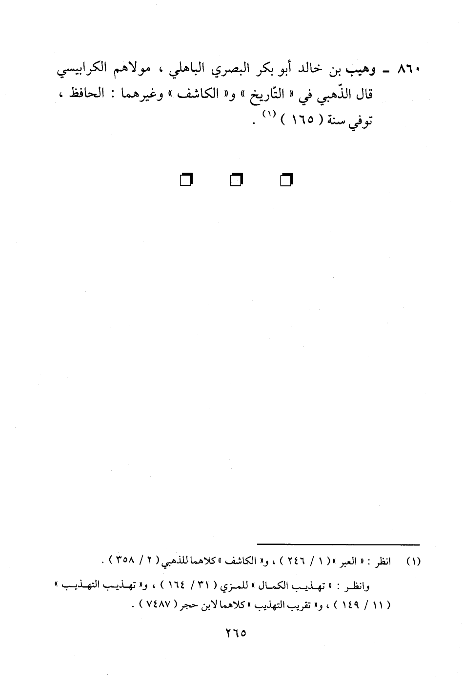 860 - وهيب بن خالد أبو بكر البصري الباهلي، مولاهم الكرابيسي قال الذّهبي في "التّاريخ" و"الكاشف" وغيرهما: الحافظ، توفي سنة (165) (¬1).