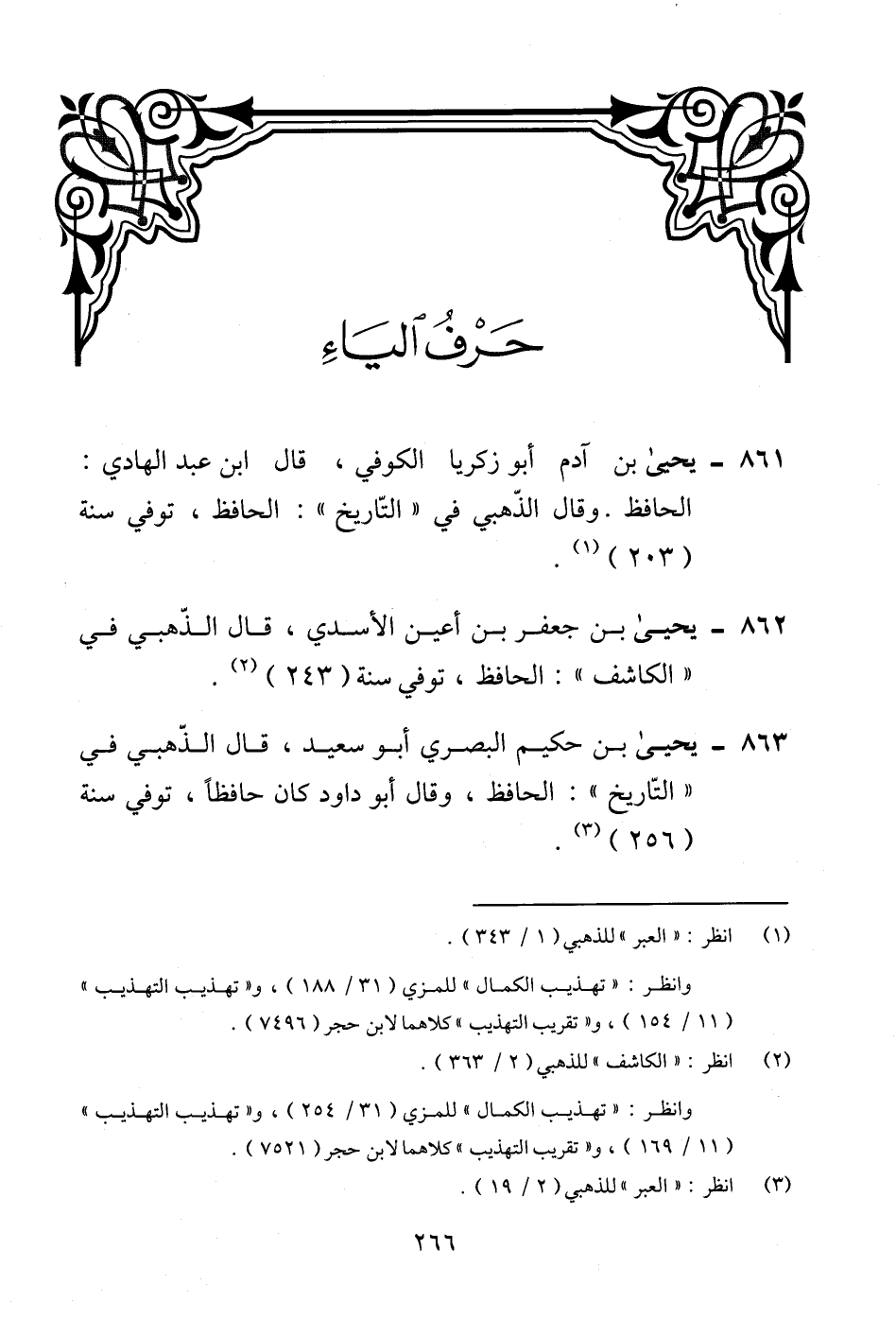 861 - يحيى بن آدم أبو زكريا الكوفي، قال ابن عبد الهادي: الحافظ. وقال الذّهبي في "التّاريخ": الحافظ، توفي سنة (203) (¬1).