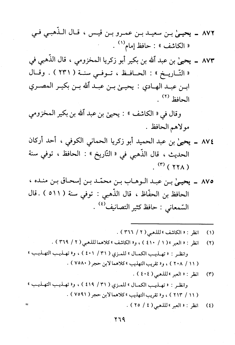 873 - يحيى بن عبد الله بن بكير أبو زكريا المخزومي، قال الذّهبي في "التّاريخ": الحافظ، توفي سنة (231). وقال ابن عبد الهادي: يحيى بن عبد الله بن بكير المصري الحافظ (¬2).