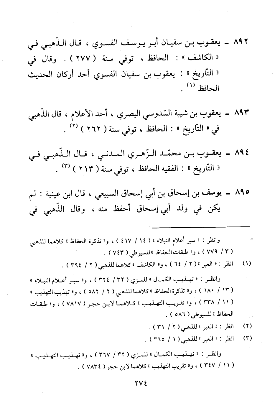 892 - يعقوب بن سفيان أبو يوسف الفسوي، قال الذّهبي في "الكاشف": الحافظ، توفي سنة (277). وقال في "التّاريخ": يعقوب بن سفيان الفسوي أحد أركان الحديث الحافظ (¬1).