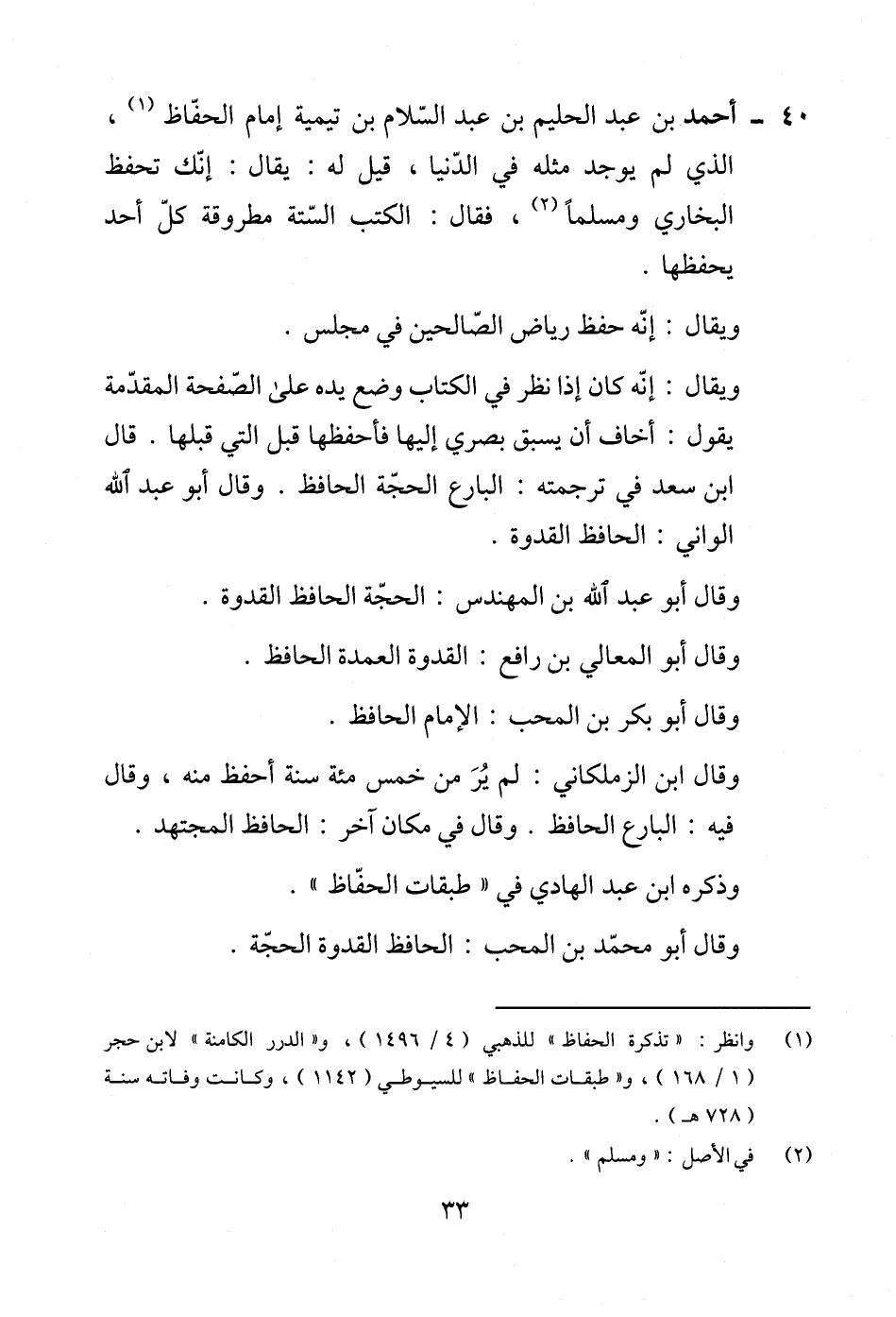 40 - أحمد بن عبد الحليم بن عبد السّلام بن تيمية إمام الحفّاظ (¬1)، الذي لم يوجد مثله في الدّنيا، قيل له: يقال: إنّك تحفظ البخاري ومسلمًا (¬2)، فقال: الكتب السّتة مطروقة كلّ أحد يحفظها.
