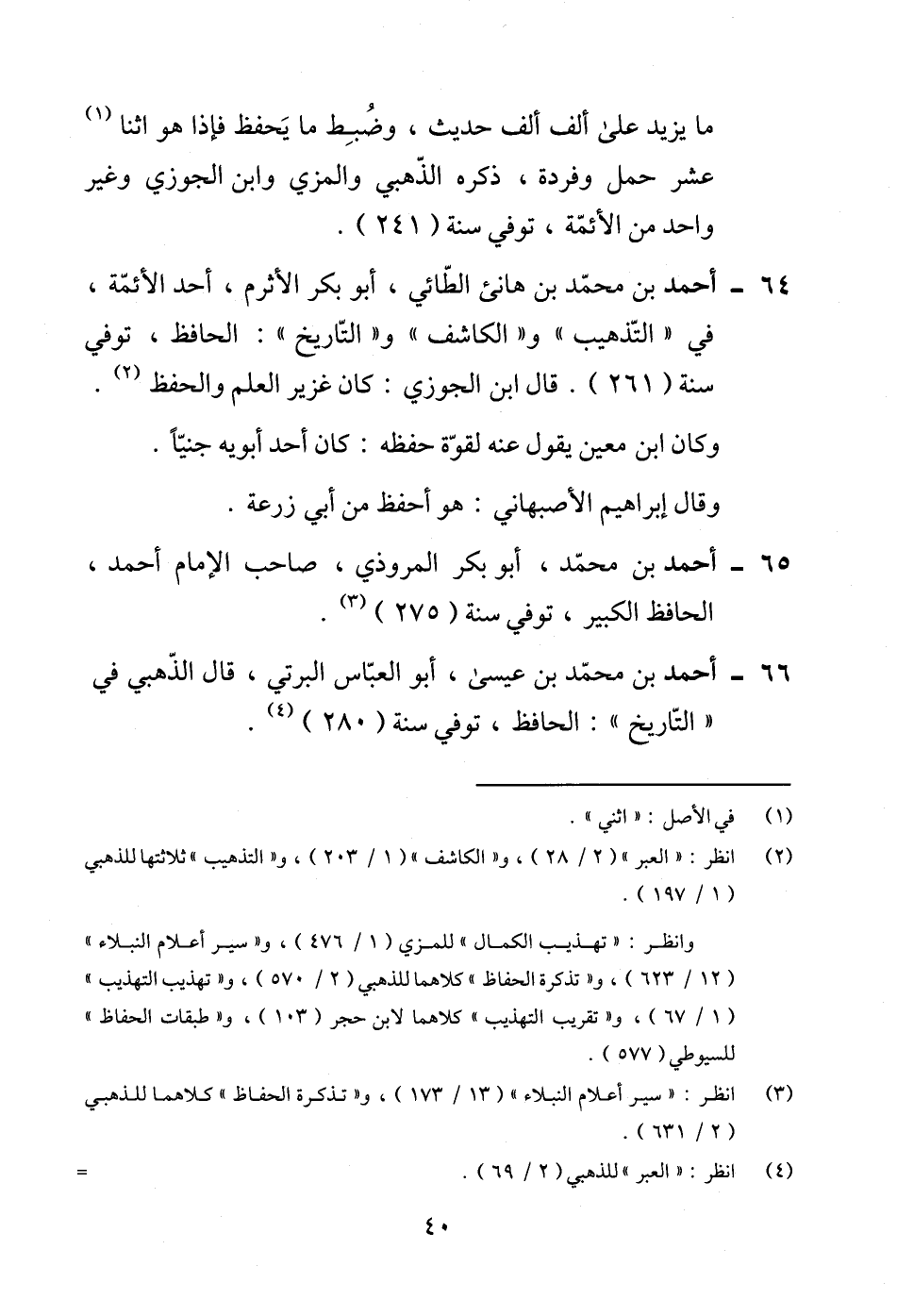 64 - أحمد بن محمّد بن هانئ الطّائي، أبو بكر الأثرم، أحد الأئمّة، في "التّذهيب" و"الكاشف" و"التّاريخ": الحافظ، توفي سنة (261). قال ابن الجوزي: كان غزير العلم والحفظ (¬2).
