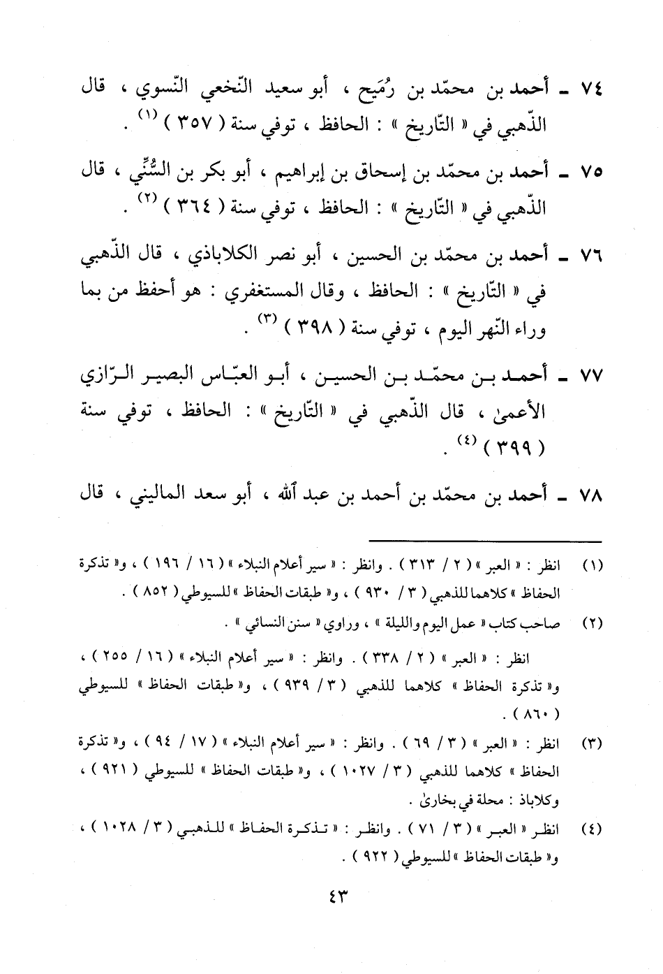 76 - أحمد بن محمّد بن الحسين، أبو نصر الكلاباذي، قال الذّهبي في "التّاريخ": الحافظ، وقال المستغفري: هو أحفظ من بما وراء النّهر اليوم، توفي سنة (398) (¬3).
