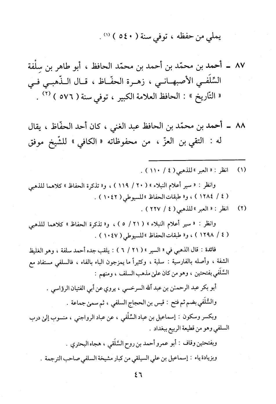 87 - أحمد بن محمّد بن أحمد بن محمّد الحافظ، أبو طاهر بن سِلْفة السِّلَفي الأصبهاني، زهرة الحفّاظ، قال الذّهبي في "التّاريخ": الحافظ العلامة الكبير، توفي سنة (576) (¬2).