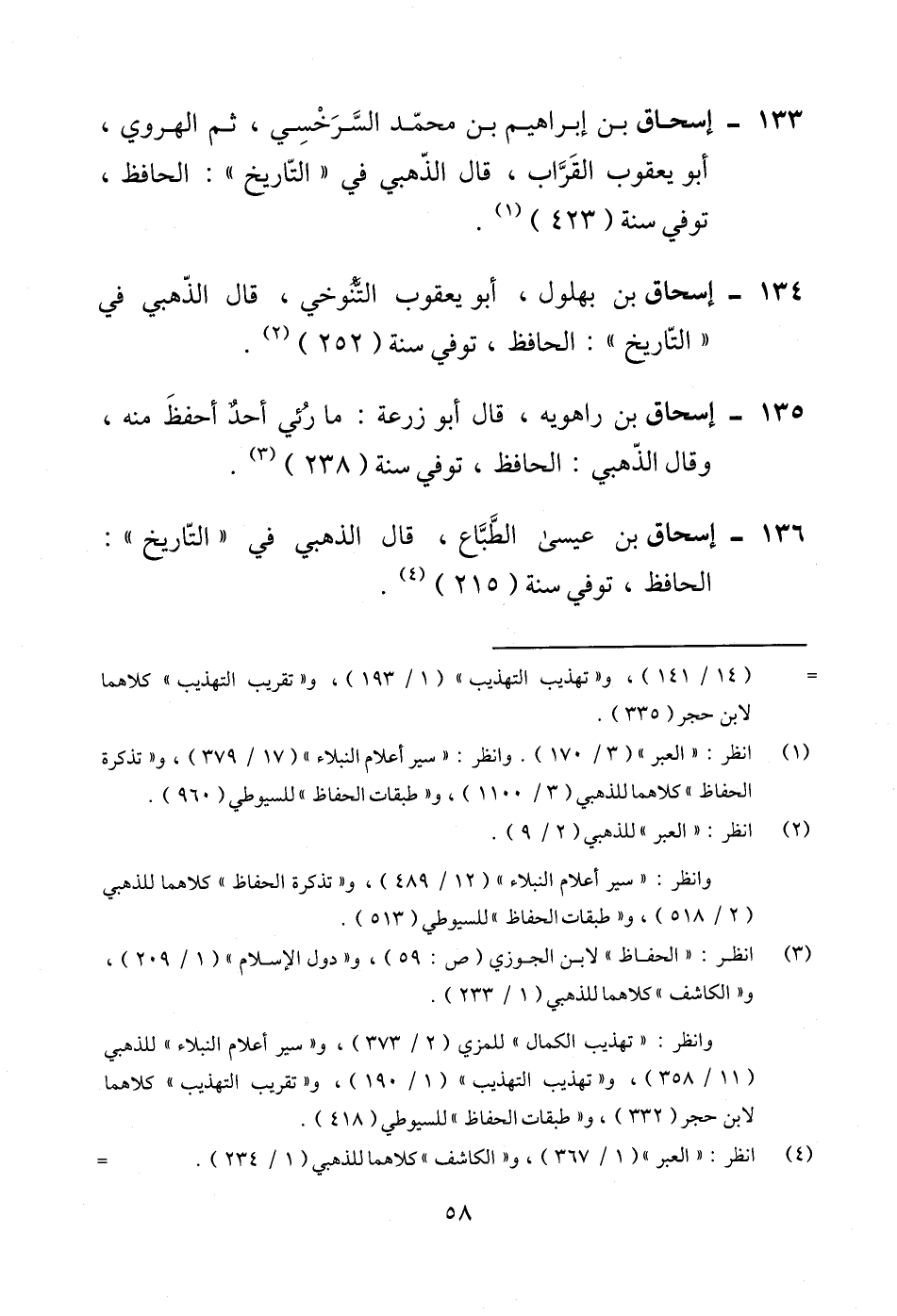 135 - إسحاق بن راهويه، قال أبو زرعة: ما رُئي أحدٌ أحفظَ منه، وقال الذّهبي: الحافظ، توفي سنة (238) (¬3).