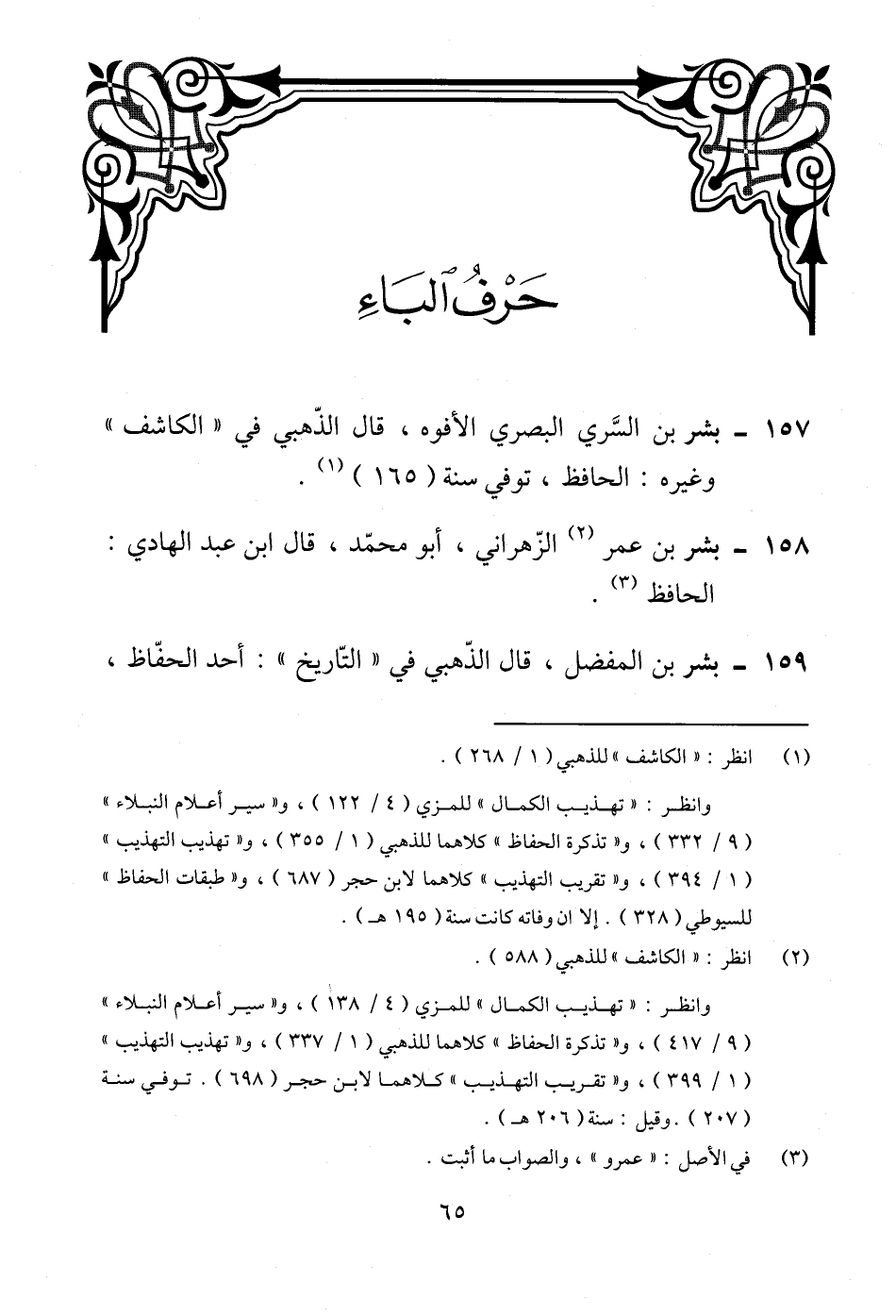 157 - بشر بن السَّري البصري الأفوه، قال الذّهبي في "الكاشف" وغيره: الحافظ، توفي سنة (165) (¬1).