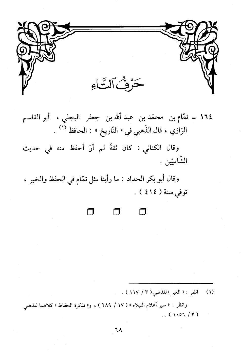 164 - تمّام بن محمّد بن عبد الله بن جعفر البجلي، أبو القاسم الرّازي، قال الذّهبي في "التّاريخ": الحافظ (¬1).