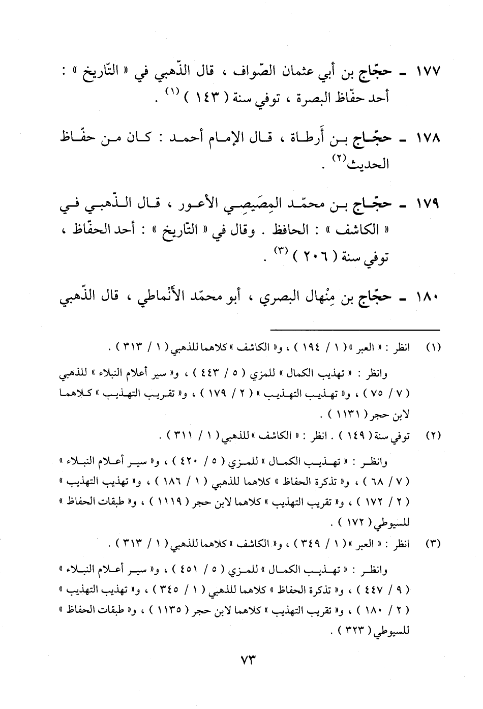 179 - حجّاج بن محمّد المِصَيصِي الأعور، قال الذّهبي في "الكاشف": الحافظ. وقال في "التّاريخ": أحد الحفّاظ، توفي سنة (206) (¬3).