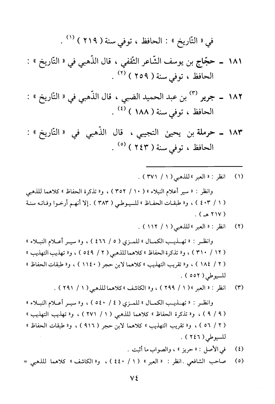 182 - جرير (¬3) بن عبد الحميد الضبي، قال الذّهبي في "التّاريخ": الحافظ، توفي سنة (188) (¬4).