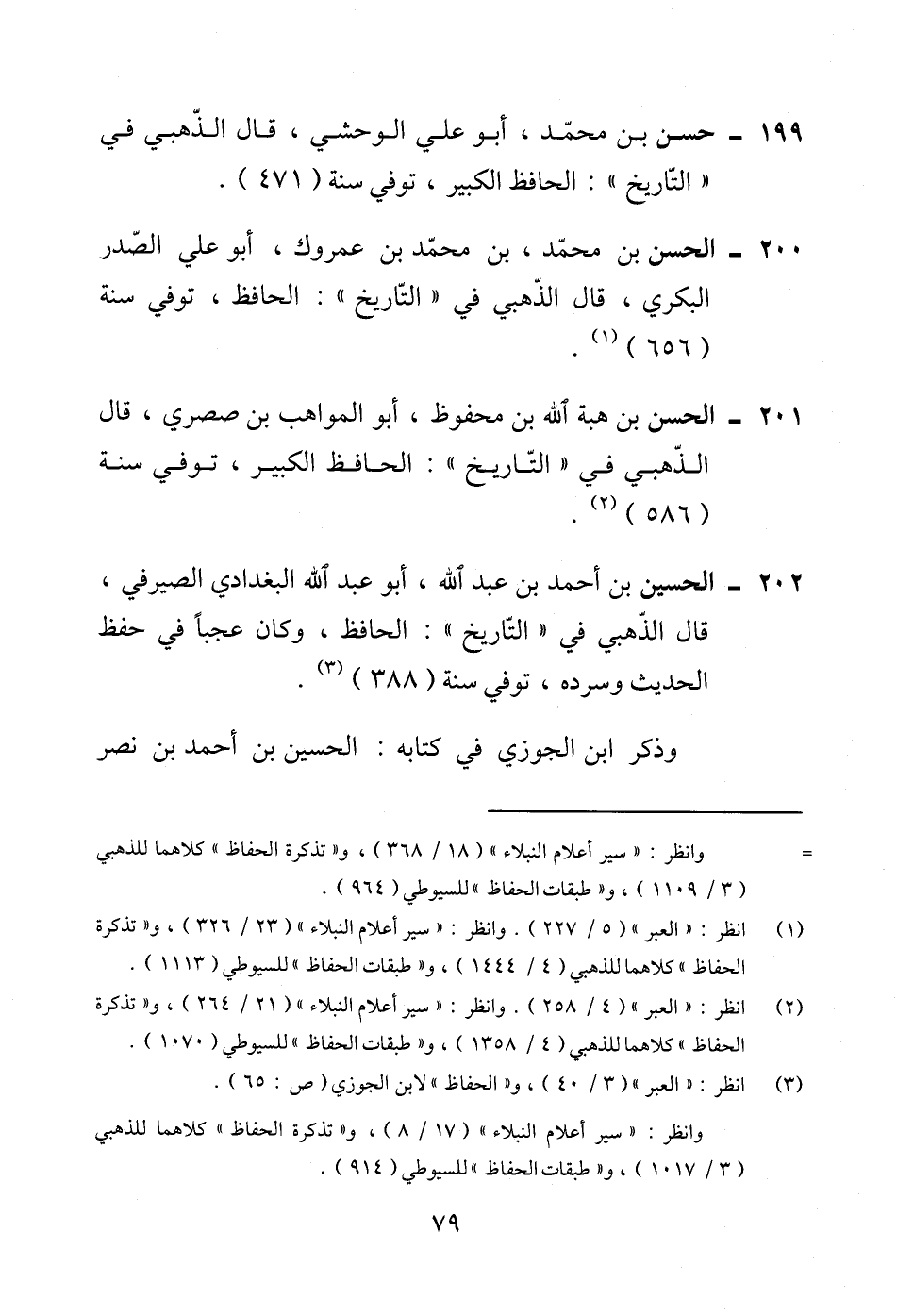 199 - حسن بن محمّد، أبو علي الوحشي، قال الذّهبي في "التّاريخ": الحافظ الكبير، توفي سنة (471).