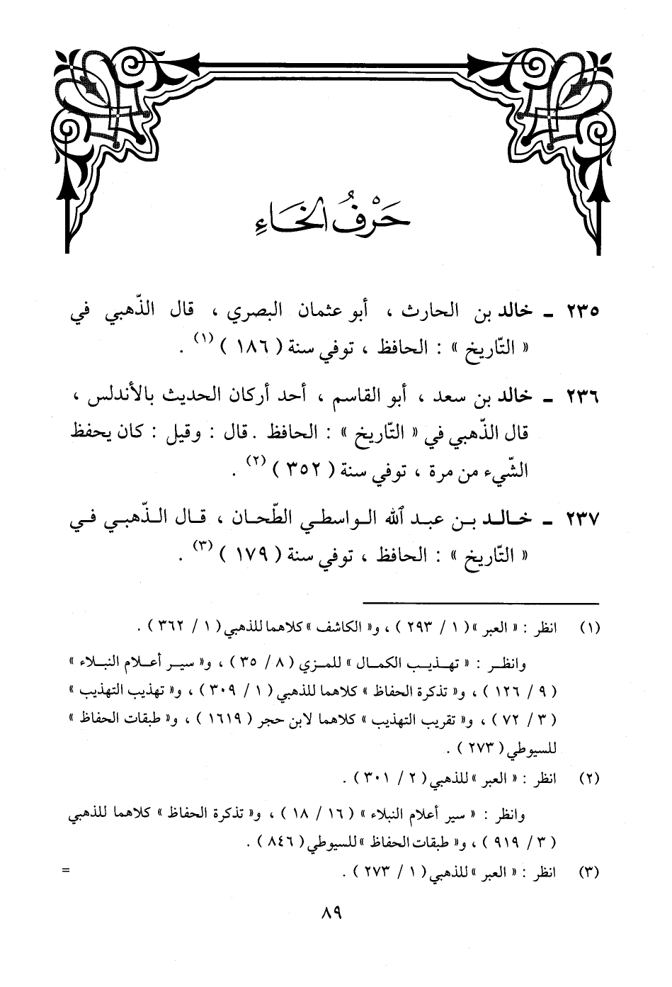 236 - خالد بن سعد، أبو القاسم، أحد أركان الحديث بالأندلس، قال الذّهبي في "التّاريخ": الحافظ. قال: وقيل: كان يحفظ الشّيء من مرة، توفي سنة (352) (¬2).
