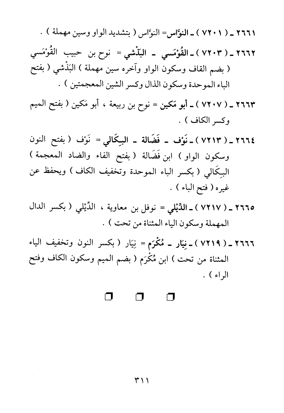 2664 - (7213) - نَوْف - فَضَالة - البِكَالي = نَوْف (بفتح النون وسكون الواو) ابن فَضَالة (بفتح الفاء والضاد المعجمة) البِكَالي (بكسر الباء الموحدة وتخفيف الكاف) ويحفظ عن غيره (فتح الباء).