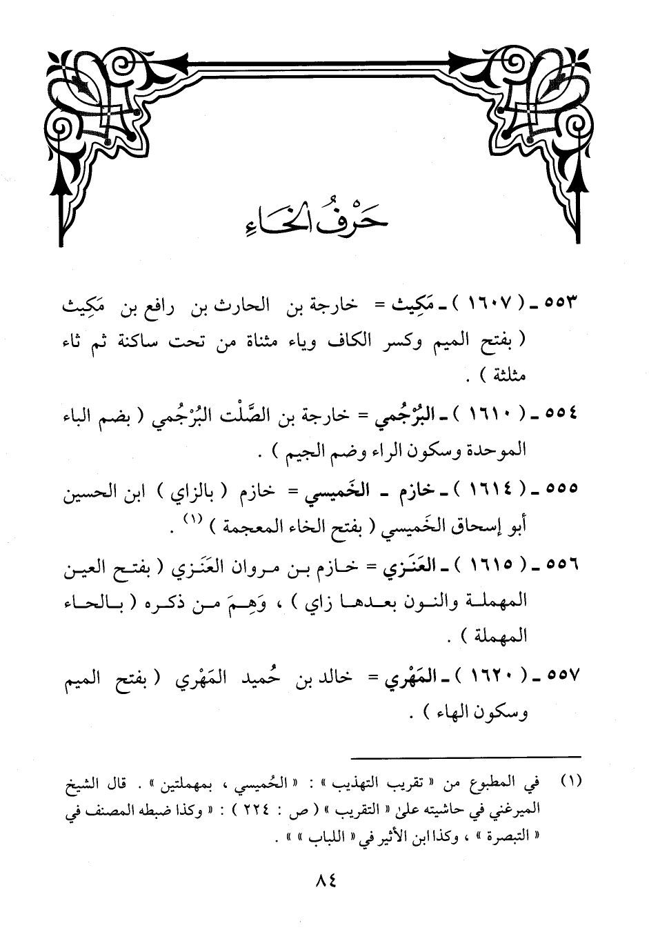(¬1) في المطبوع من "تقريب التهذيب": "الحُميسي، بمهملتين". قال الشيخ الميرغني في حاشيته على "التقريب" (ص: 224): "وكذا ضبطه المصنف في "التبصرة"، وكذا ابن الأثير في "اللباب" ".