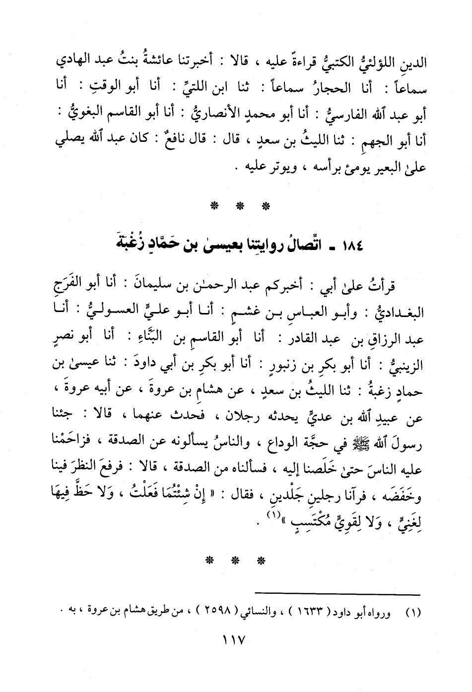 قرأتُ على أبي: أخبركم عبد الرحمن بن سليمانَ: أنا أبو الفَرَجِ البغداديُّ: وأبو العباسِ بن غشمٍ: أنا أبو عليٍّ العسوليُّ: أنا عبد الرزاقِ بن عبد القادر: أنا أبو القاسمِ بن البَنَّاءِ: أنا أبو نصرٍ الزينبيُّ: أنا أبو بكرِ بن زنبورٍ: أنا أبو بكرِ بن أبي داودَ: ثنا عيسى بن حمادٍ زغبةُ: ثنا الليثُ بن سعدٍ، عن هشامِ بن عروةَ، عن أبيه عروةَ، عن عبيدِألله بن عديٍّ يحدثه رجلان، فحدث عنهما، قالا: جئنا رسولَ الله - صلى الله عليه وسلم - في حجَّة الوداع، والناسُ يسألونه عن الصدقة، فزاحَمْنا عليه الناسَ حتى خَلَصنا إليه، فسألناه من الصدقة، قالا: فرفعَ النظرَ فينا وخَفَضَه، فرآنا رجلينِ جَلْدينِ، فقال: "إِنْ شِئْتُمَا فَعَلْتُ، وَلا حَظَّ فِيهَا لِغَنِيٍّ، وَلا لِقَوِيٍّ مُكْتَسِبٍ" (¬1).